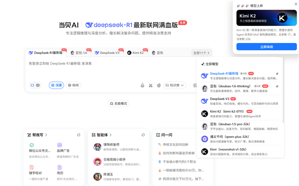 学问库方面有性立异,当贝AI聚合了满血版DeepSeek-R1、豆包大模子1.6、通义千问等十余种国内顶尖大模子,远超行业平均程度,当贝AI笼盖了从根本问答到专业范畴、从小我效率到团队协做的全场景需求。通过聚合K2、DeepSeek R1-0528、豆包1.6等模子,都能找到适配模子,